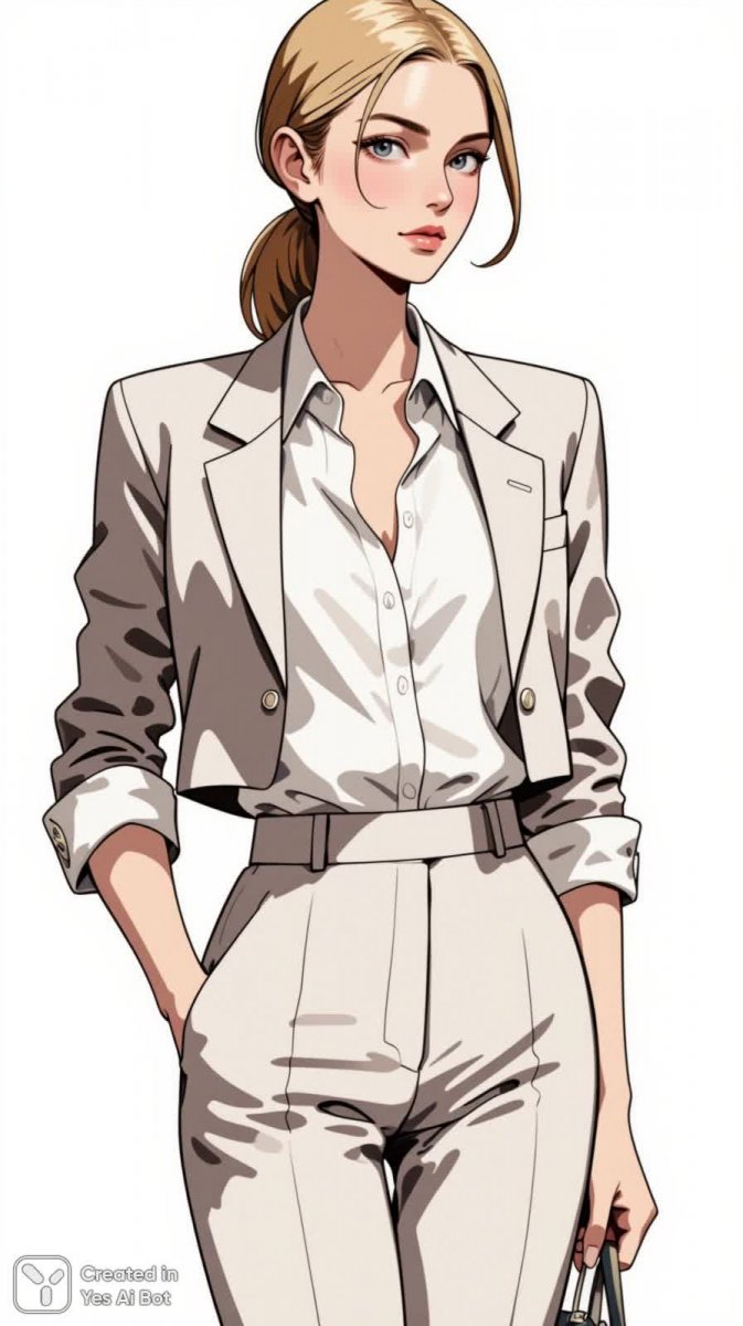 fashion illustration of woman in a chic tailored suit, wearing cropped blazer with high neckline, paired with matching trousers and white blouse, hair styled in sleek ponytail, BG is simple white.