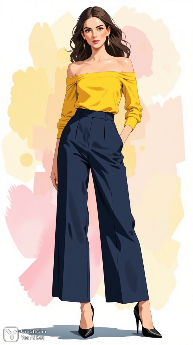 1. fashion illustration woman in bright yellow off-the-shoulder top with long sleeves, paired with high-waisted navy wide-leg trousers, wearing pointed toe black heels, hair styled in loose waves, BG is soft pastel.