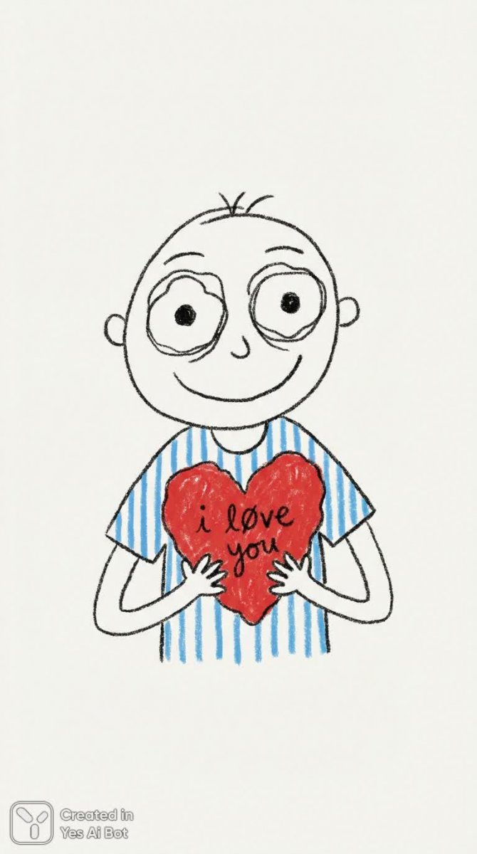 funny drawn boy with big eyes in vertical striped t-shirt, beaming smile, clutching red heart saying "i l0ve you", light white BG, cartoon style, minimalistic approach.