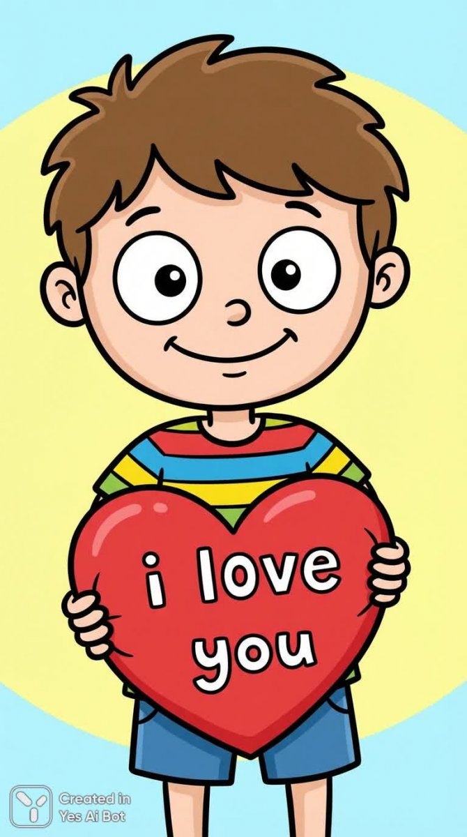 cartoon boy with big round eyes, wearing colorful striped shirt, grinning, holding red heart with "i l0ve you" written on it, light background, outline style, cheerful mood.