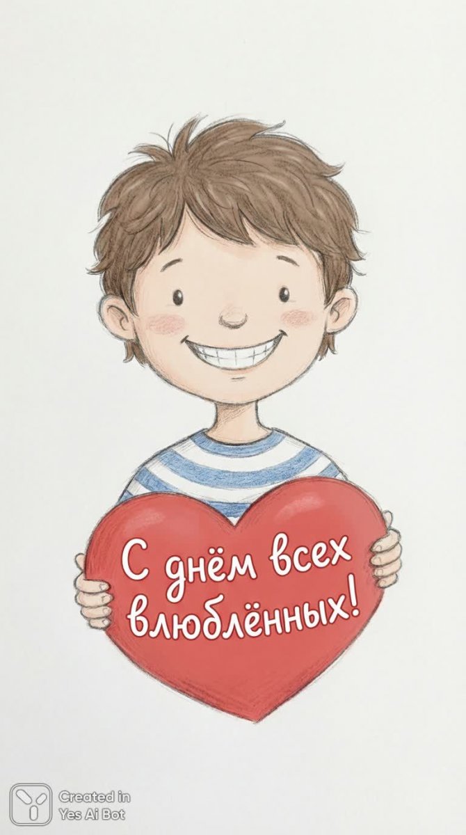 drawn young boy, wearing horizontal striped shirt, large smile, holding red heart with message in russian: "С днëм всех влюблëнных!", cheerful expression, plain white background, cartoon style, soft lines.
