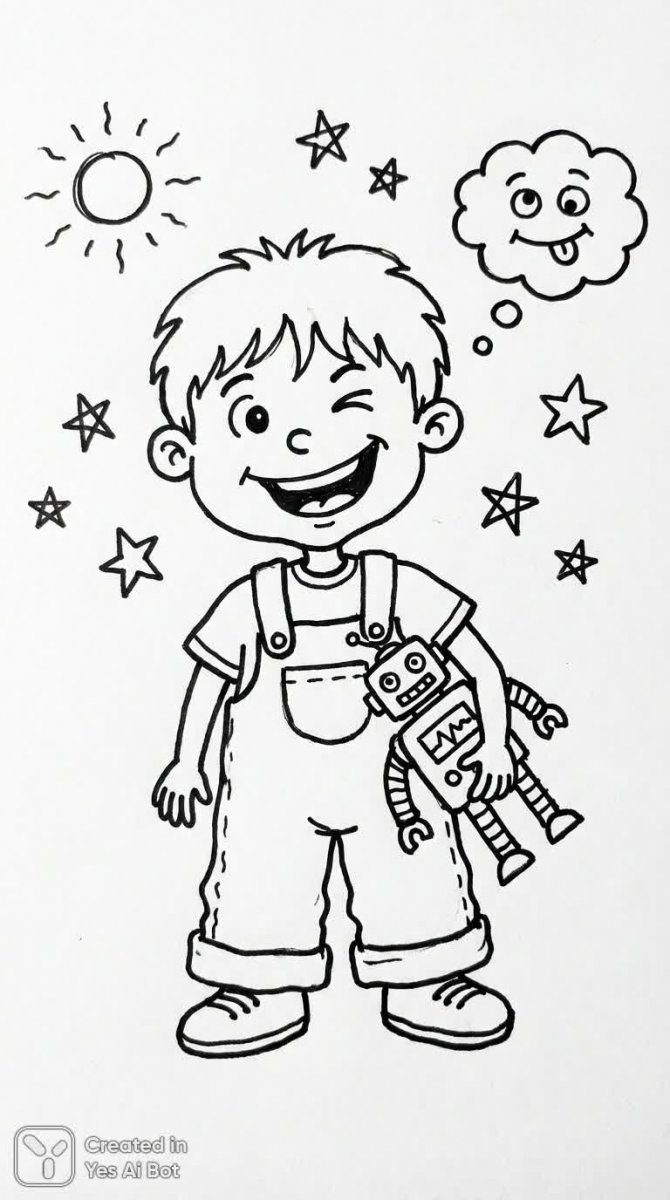 Весёлый мальчик: чёрно-белый мультяшный эскиз с простыми линиями и игривыми выражениями - Картинка, полученная с помощью нейросети Nano-Banana