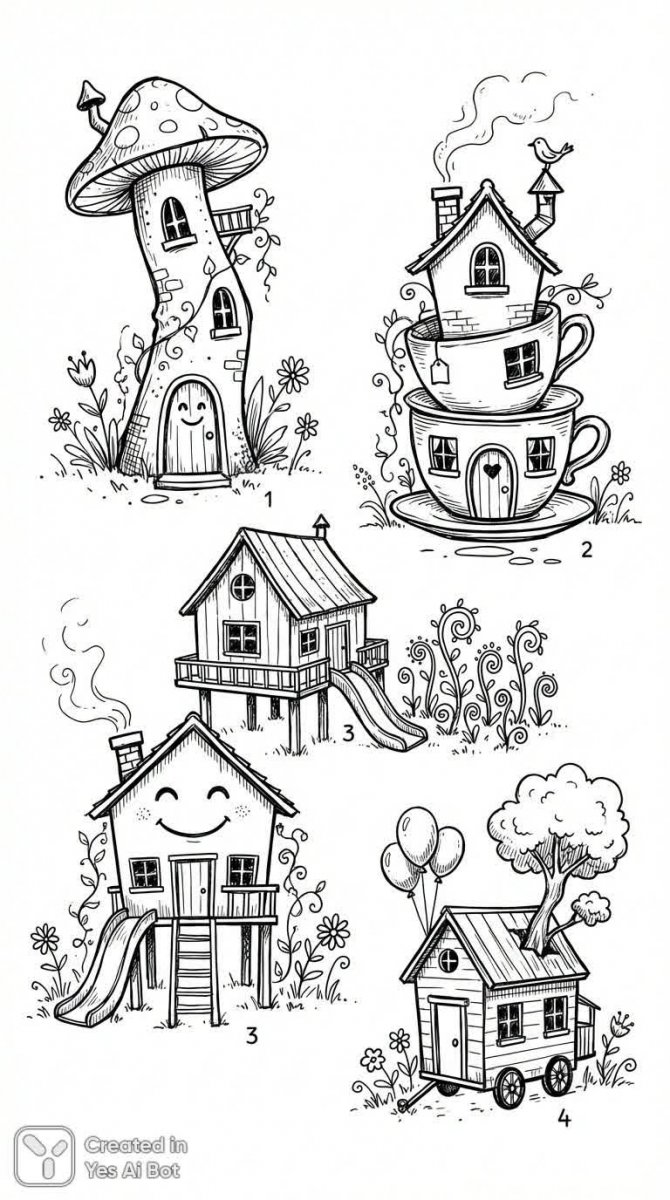 Очаровательные домики: минималистичный эскиз в черно-белых тонах с декоративными растениями и индивидуальным характером - Результат генерации нейросети Nano Banana