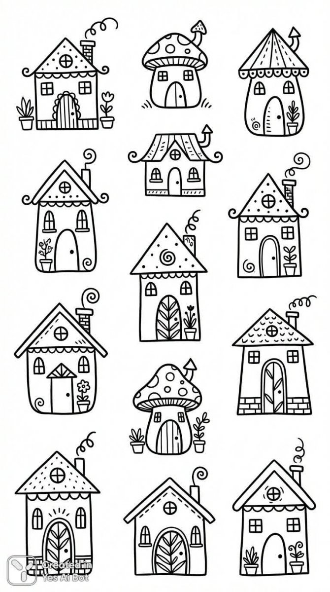 Очаровательный набор черно-белых рисунков в стиле дудла изображает причудливые домики. Минималистичный дизайн подчеркнут разнообразием милых форм и простых линий, создавая ощущение легкости и беззаботности. Иллюстрации выполнены без фона, что позволяет им выделяться и фокусировать внимание на деталях. Нежные элементы растений добавляют живости и свежести этим игривым изображениям. Каждый домик уникален благодаря продуманным забавным деталям, которые придают персональный характер каждой постройке. Этот набор идеально подойдет для создания уютной атмосферы в детской комнате, оформления открыток или использования как графические элементы в различных проектах. Простота исполнения сочетается с оригинальностью концепции, делая эти рисунки универсальными и привлекательными для широкой аудитории. Они словно сошли со страниц волшебной сказки, где каждый домик хранит свою собственную историю и наполнен теплом и уютом. Прекрасный выбор для тех, кто ценит творчество и оригинальный дизайн в минималистичном стиле. Эти рисунки не только радуют глаз, но и вдохновляют на создание чего-то прекрасного и неповторимого