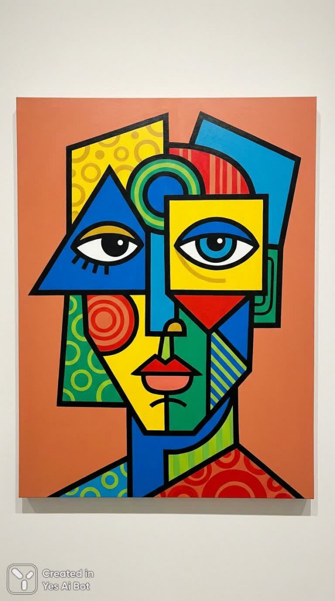 Завораживающий портрет, где лицо разделено на четкие геометрические секции, создавая ощущение сложной мозаики. Яркая палитра цветов оживляет изображение, а большие, выразительные глаза притягивают взгляд и передают глубину эмоций. Четкие, толстые черные контуры подчеркивают структуру лица и добавляют графичности композиции. Минималистичный стиль исполнения создает ощущение чистоты и современности, а однотонный фон позволяет сосредоточиться на деталях портрета. Это произведение современного искусства сочетает в себе элементы графических узоров и абстракции, демонстрируя уникальный подход к изображению человеческого лица. Каждое геометрическое разделение несет в себе определенный смысл, формируя целостное художественное высказывание. Использование насыщенных цветов придает портрету динамизм и энергию, а лаконичность композиции подчеркивает ее эстетическую привлекательность. В целом, это произведение представляет собой яркий пример современного графического искусства, сочетающего в себе техническое мастерство и творческий замысел. Оно способно вызвать у зрителя широкий спектр эмоций и заставить задуматься о природе человеческой красоты и самовыражения