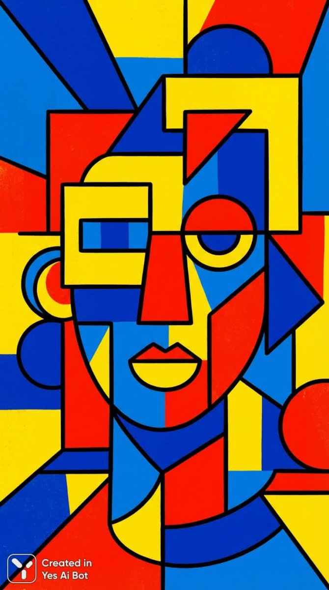 Яркий портрет в стиле кубизма, выполненный с использованием геометрических форм и насыщенных основных цветов. Лицо разделено на отдельные плоскости, каждая из которых выделена четкими контурами, создавая ощущение динамики и движения. Современное искусство представлено в форме плоского дизайна, где акцент сделан на контрастных тонах и ярком фоне, усиливающем визуальный эффект. Картина демонстрирует смелое сочетание геометрических фигур, придающих изображению современный и запоминающийся вид. Разделенные черты лица и игра света и тени формируют уникальную композицию, отражающую новаторский подход к портретной живописи. Использование ярких цветов и динамичных форм придает работе энергию и выразительность, подчеркивая индивидуальность и оригинальность стиля. Картина является прекрасным примером современного искусства, сочетающего в себе смелость экспериментов и глубокое понимание принципов композиции и цвета. Она захватывает внимание своей необычностью и ярким визуальным языком, предлагая зрителю новый взгляд на традиционный жанр портрета. Работа выполнена с использованием плоского дизайна, что добавляет ей лаконичности и современности, а также подчеркивает игру геометрических форм и контрастных тонов. Этот кубистический портрет – взрыв цвета и формы, воплощение современного художественного видения