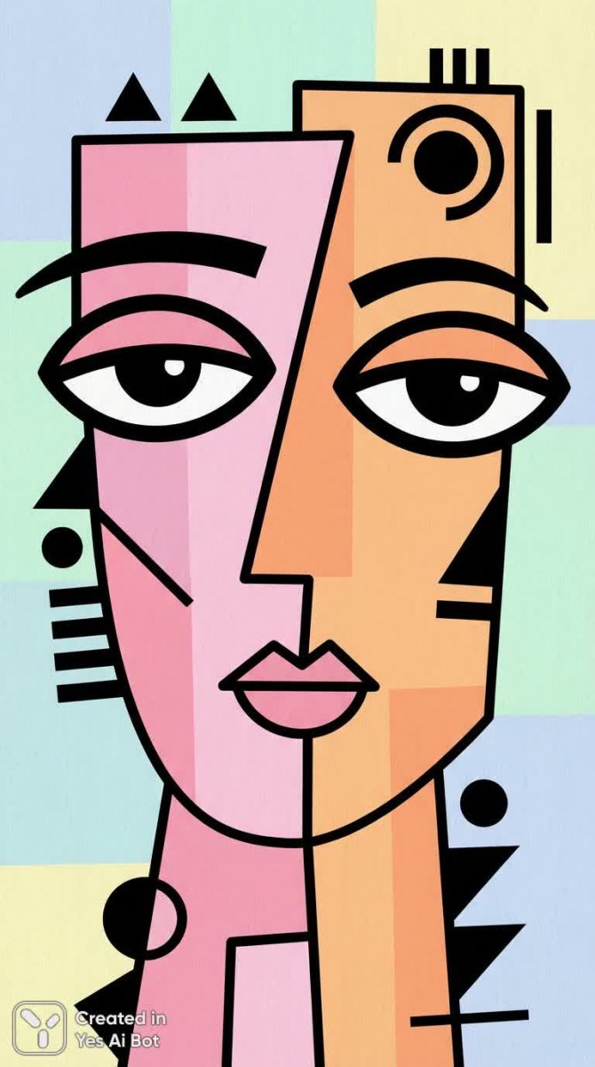 Яркий и динамичный образ лица, разделенный на две симметричные половины – нежно-розовую и насыщенно-оранжевую. Выразительные графические глаза привлекают внимание своим увеличенным размером и четкостью линий. Черные геометрические акценты добавляют композиции структуру и современный вид, создавая ощущение лаконичности и строгости в сочетании с игривым настроением. Пастельный фон подчеркивает легкость и воздушность всей картины, позволяя основным элементам визуально выделяться на его фоне. Минималистичный подход к деталям усиливает эффект простоты и элегантности, а смелые контуры придают изображению выразительность и завершенность. Это стилизованное лицо – воплощение современного искусства, сочетающее в себе абстрактные формы, яркие цвета и графическую точность, создавая запоминающийся визуальный опыт. Композиция продумана до мелочей, каждый элемент играет свою роль в создании гармоничного и привлекательного образа. Использование контрастных цветов и геометрических фигур придает работе динамику и энергию, делая ее актуальной и современной. Пастельная палитра фона смягчает общую яркость, создавая приятную визуальную атмосферу. В целом, это произведение искусства – яркий пример минималистичного дизайна с акцентом на графические элементы и игру цвета