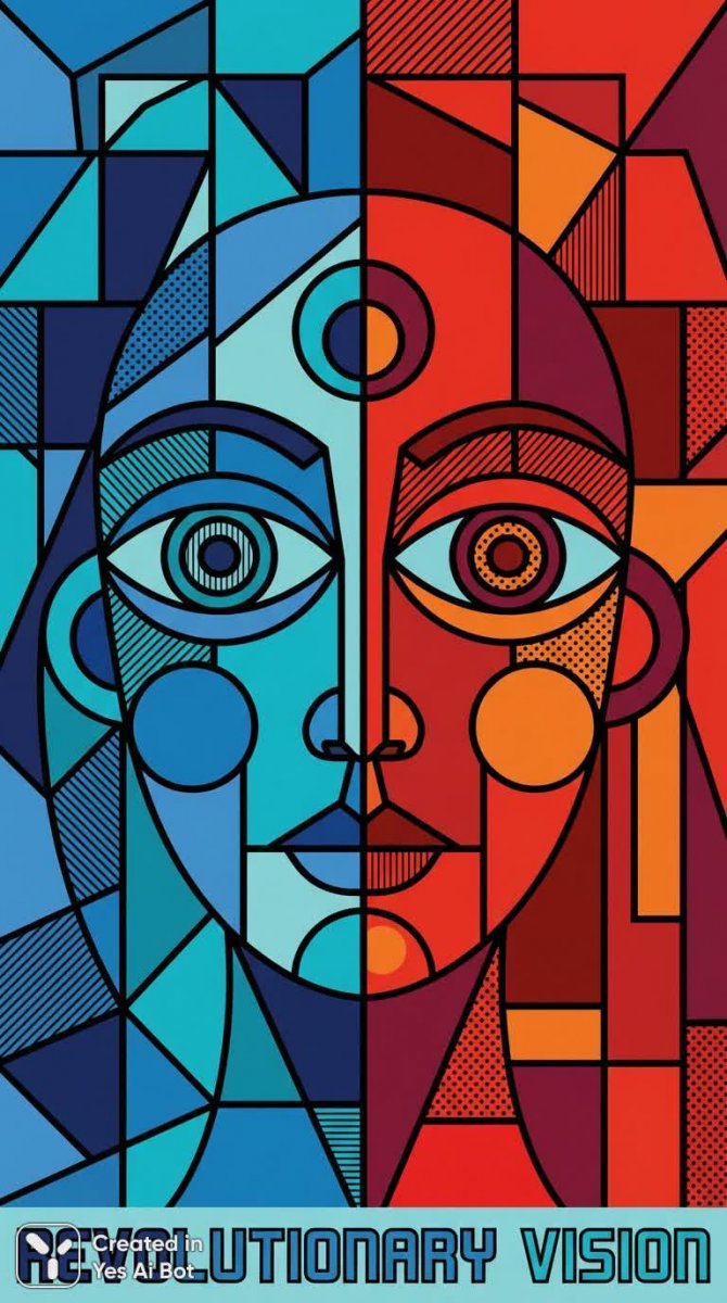 Завораживающий абстрактный портрет женщины, сотканный из смелых цветовых решений – глубокого синего и насыщенного красного. Изображение отличается стилизацией черт лица, где каждая деталь подчинена гармонии геометрических форм. Особое внимание привлекают увеличенные, выразительные глаза, словно отражающие внутренний мир героини. Художественные узоры, искусно вплетенные в композицию, добавляют работе глубины и загадочности. Плоский дизайн подчеркивает современность подхода, а лаконичность линий и четкость форм создают ощущение графического совершенства. Это произведение – яркий пример современного графического искусства, где абстракция встречается с реализмом, а эмоции передаются через игру цвета и формы. Картина излучает энергию и динамизм, притягивая взгляд и заставляя задуматься о красоте в ее самых неожиданных проявлениях. Такой арт-объект станет прекрасным украшением интерьера, подчеркивая изысканный вкус владельца и его тягу к современному искусству. Это не просто портрет – это визуальная поэма, рассказывающая историю без слов, наполненная символизмом и эстетическим наслаждением. В нем сочетаются элементы классической живописи и цифровой графики, создавая уникальный художественный язык