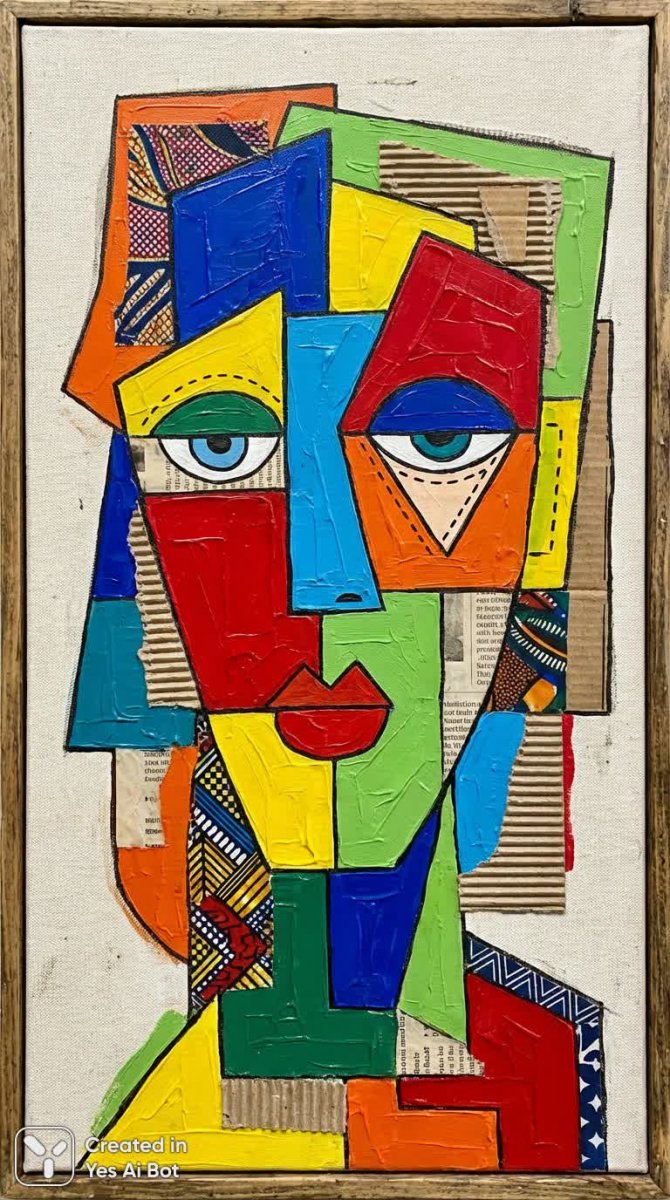 Яркое полотно, сотканное из геометрических форм и смелых цветовых решений в духе кубизма, представляет собой абстрактный портрет. Лицо лишено привычных черт, растворяясь в игре асимметричных блоков цвета, создающих динамичную композицию. Стилизованные глаза, схематично изображенные, придают произведению загадочность и глубину. Абстрактные узоры, словно живые, переплетаются друг с другом, образуя сложную текстуру фона, которая подчеркивает многогранность изображения. Картина излучает энергию современности, являясь ярким примером актуального искусства, где форма преобладает над реалистичным отображением, а цвет становится главным выразительным средством. Эта работа – не просто изображение лица, это исследование возможностей абстракции и её способности передавать эмоции и идеи через визуальный язык, предлагая зрителю свободу интерпретации и погружение в мир чистых форм и ярких красок. Художественный замысел направлен на создание уникального визуального опыта, где каждый элемент играет свою роль в создании гармоничного и запоминающегося образа