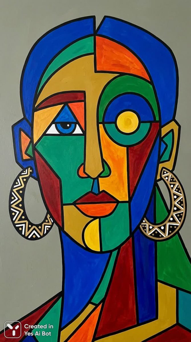 Современный минималистичный портрет в стиле кубизма представляет собой яркое исследование формы и цвета. Лицо изображено крупным планом и разбито на смелые геометрические плоскости, наполненные насыщенными цветами. Четкие черные контуры подчеркивают структуру изображения, создавая графический эффект. Декоративные серьги добавляют портрету изысканности и акцентируют внимание на деталях. Простой однотонный фон позволяет сосредоточиться на выразительных глазах и смелой игре геометрических фигур. Картина излучает энергию и динамизм, воплощая в себе принципы современного искусства с его любовью к упрощению и абстракции. Это не просто изображение лица, это исследование визуального языка, где форма и цвет сливаются воедино, чтобы создать запоминающийся художественный образ. Композиция отличается лаконичностью и гармонией, а использование плоских форм придает работе ощущение легкости и воздушности. Художественное решение подчеркивает индивидуальность модели, представляя ее в виде абстрактной интерпретации, лишенной излишней реалистичности. Акцент на выразительных глазах создает эффект живого контакта со зрителем, приглашая к размышлениям о природе человеческой личности и красоте абстракции. Работа является прекрасным примером современного минимализма в портретной живописи, сочетая в себе смелость художественного решения и элегантность исполнения