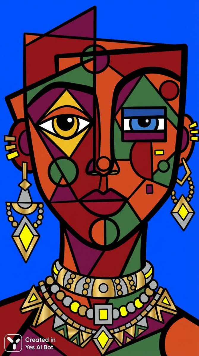 abstract ethnic portrait, close-up with multicolored geometric patterns, bright yellow accents, intricate jewelry details, asymmetrical face design, vibrant blue bg, stylized eyes, minimalistic style, bold graphic lines, modern art.