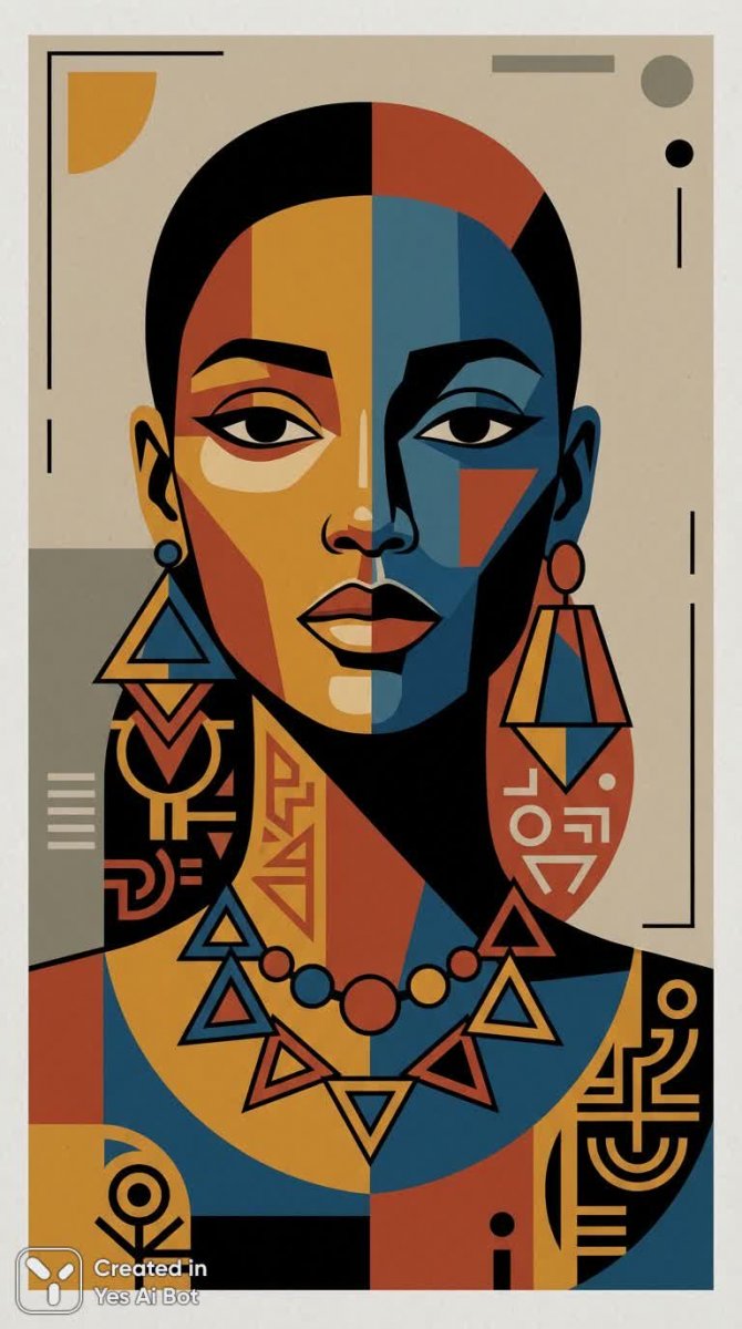 Яркий этнический портрет, захватывающий взгляд своей необычной композицией и насыщенностью деталей. Лицо разделено на две контрастные цветовые палитры, создавая эффектную игру света и тени, подчеркивающую глубину характера. Изящные орнаментальные элементы гармонично переплетаются с крупными геометрическими украшениями, придающими образу монументальность и загадочность. Декоративные акценты добавляют визуальный интерес, не перегружая общее впечатление. Фон выполнен в нейтральных тонах, что позволяет полностью сосредоточиться на выразительном лице и его деталях. Стиль изображения сочетает элементы современной графики и минимализма, создавая лаконичное и запоминающееся произведение искусства. Контраст цветов и форм усиливает визуальное воздействие, делая портрет динамичным и привлекающим внимание. Использование ярких оттенков и четких линий придает изображению современный и стильный вид, а этнические мотивы добавляют глубины и культурной значимости. В целом, это произведение представляет собой гармоничное сочетание традиционных элементов и современных художественных приемов, создавая уникальное визуальное впечатление. Портрет излучает силу, уверенность и загадочность, оставляя зрителя в состоянии размышлений о его смысле и значении