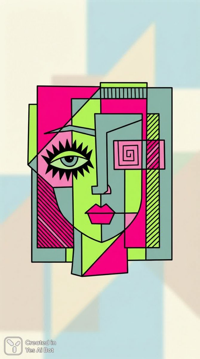 Изысканный портрет современной женщины, воплощенный в смелой графической композиции. Лицо, представленное с легкой асимметрией, излучает загадочность и уверенность. Палитра ярких, насыщенных оттенков розового и зеленого создает визуальный контраст и динамику, притягивая взгляд. Геометрические узоры и четкие линии придают изображению структуру и современный стиль, подчеркивая минималистичный фон. Выразительные, стилизованные ресницы добавляют портрету игривости и акцента на глазах, а смелые контуры формируют объем и глубину. Влияние кубизма проявляется в деконструкции формы и создании многогранного образа, отражающего современную эстетику и индивидуальность. Это произведение искусства – гармоничное сочетание абстракции, графики и цветовой гаммы, которое завораживает своей простотой и элегантностью, передавая тонкий вкус и креативность художника. Портрет словно шепчет о силе женственности и ее многогранности, воплощенной в ярких красках и четких линиях