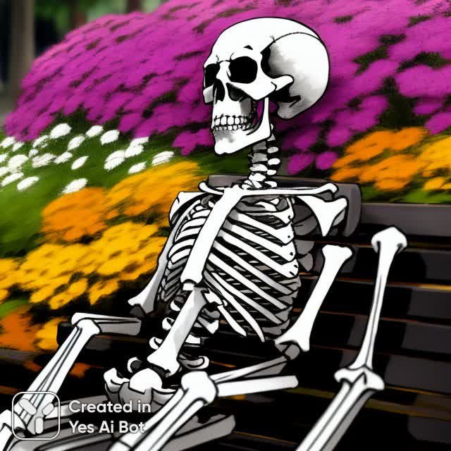 На заброшенной парковой скамейке разворачивается сюрреалистическая сцена. Одинокий скелет, опираясь на спинку деревянной скамьи, склонил голову в задумчивости, словно погруженный в глубокие размышления о бренности бытия и ускользающей красоте жизни. Перед ним, словно из другого мира, предстает пораженная девушка, ее рука инстинктивно прикрывает рот в выражении изумления и недоумения. Яркий букет разноцветных цветов, живописно разложенный на скамейке рядом со скелетом, создает резкий контраст между жизнью и смертью, надеждой и отчаянием. Этот нежданный союз символизирует хрупкость существования и неизбежность перемен, напоминая о том, что даже в самых мрачных обстоятельствах можно найти проблески красоты и загадочности. Вся композиция пронизана атмосферой меланхолии и таинственности, заставляя зрителя задуматься о вечных вопросах бытия и месте человека во вселенной. В этом странном, но завораживающем диалоге между жизнью и смертью заключена глубокая философская истина, которая способна тронуть самые тонкие струны души. Кажется, что девушка стала свидетелем чего-то невероятного, сломавшего привычный ход вещей, что заставило ее замереть в безмолвном изумлении перед лицом неизбежного конца