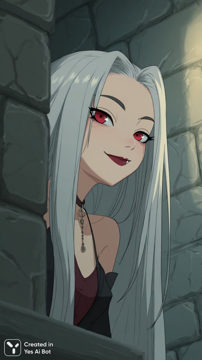 cartoon anime girl, seductive vampire with long silver hair, sharp nails, piercing red eyes, fangs, dressed in a classic gothic outfit, leaning against a stone wall, flickering candlelight, mysterious vibe, anime digital art, soft smile, bold outlines.