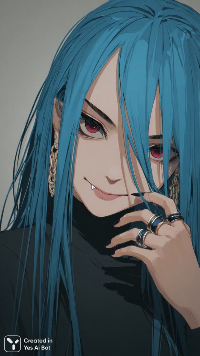 2. cartoon anime girl, vibrant gothic style, long blue hair, piercing red eyes, sharp fangs, smile, elegant rings on fingers, stylish outfit, mystical background, anime digital art, bold outlines.