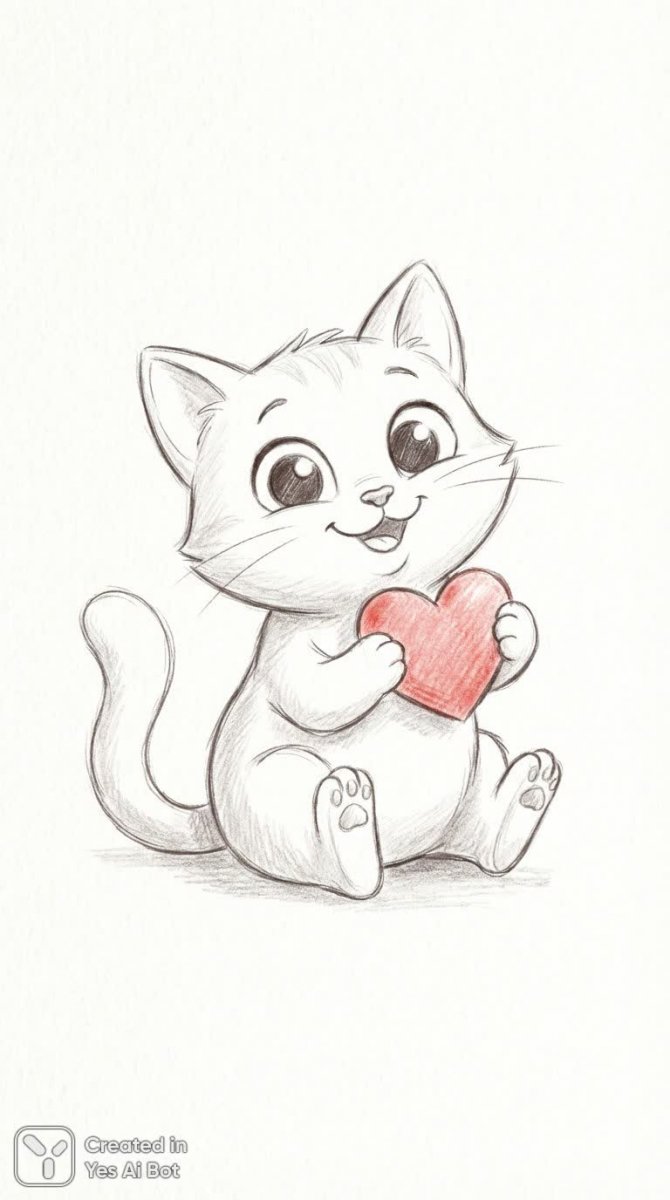 cute drawn cat, large expressive eyes, sitting down with red heart in paws, light sketch style, white background, cheerful expression, simple lines, soft shading.