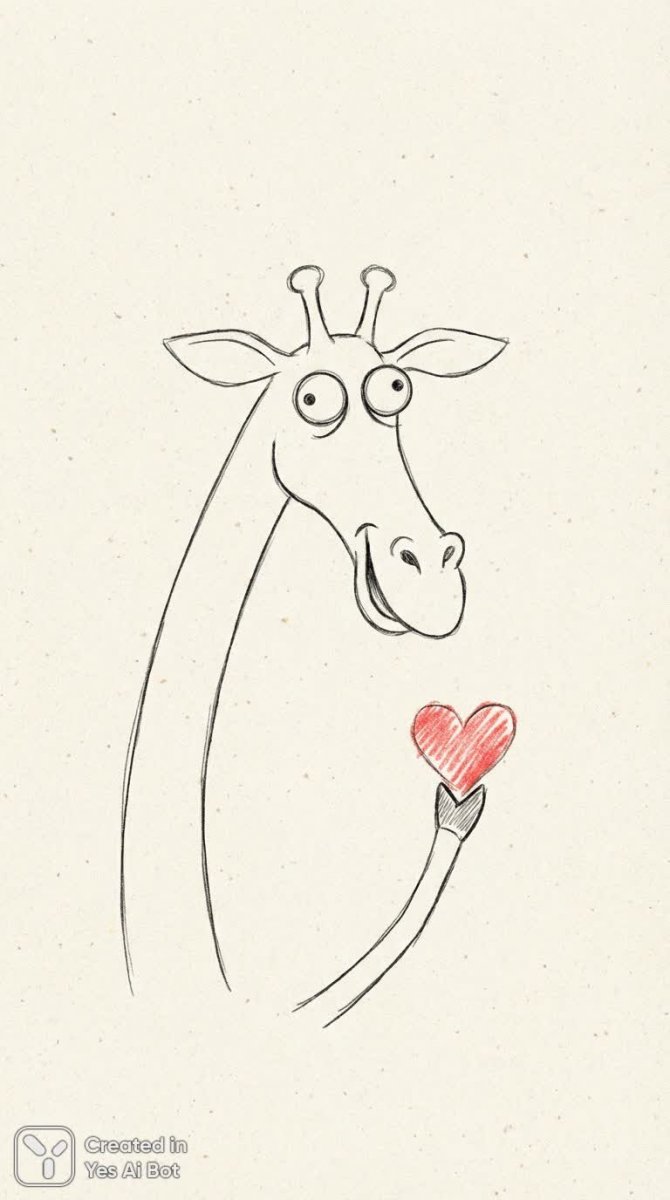 Милый мультяшный жираф с большими глазами и улыбкой держит в пасти красное сердечко, создавая позитивный и беззаботный образ. Рисунок выполнен черным карандашом на светлом текстурированном фоне в стиле минималистичного искусства, что подчеркивает простоту линий и акцентирует внимание на персонаже. Жираф излучает чувство радости и оптимизма, приглашая зрителя окунуться в атмосферу веселья и доброты. Работа выполнена нейросетью Nano Banana v.1.0 Pro по запросу, включающему описание жирафа, его эмоций и художественных деталей, таких как текстурированный фон и контур карандашом. Общий тон работы – жизнерадостный и привлекательный, подходящий для детских иллюстраций или оформления интерьера, добавляющий в любой проект немного юмора и тепла.
