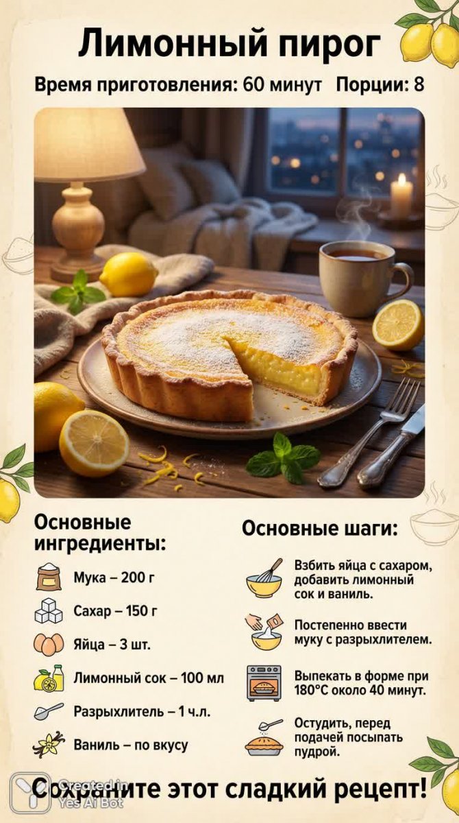 Лимонный пирог: простой рецепт для домашнего уюта и восхитительного чаепития - Пример работы нейросети NanoBanana