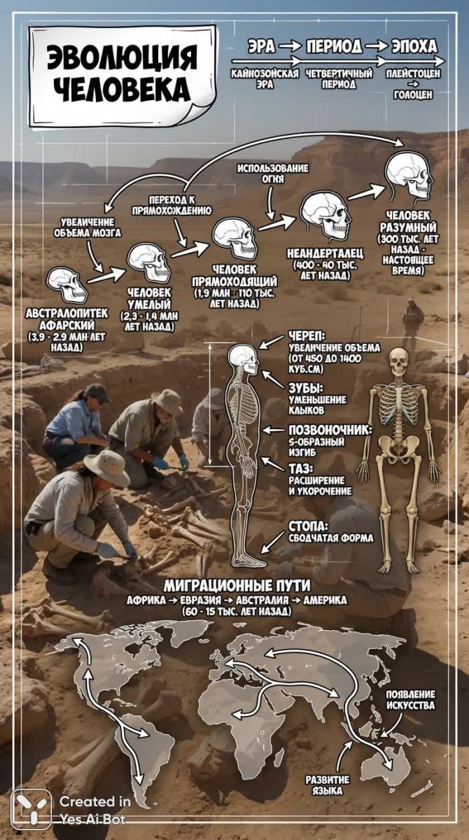 Эволюция человека: Подробная схема развития и анатомических изменений - Пример генерации нейросети Нано Банана