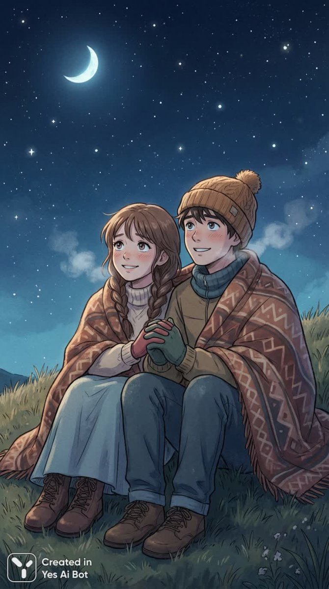 На изображении запечатлён романтический момент двух влюбленных под звёздным небом. Молодая девушка и парень укрываются общим уютным пледом, наблюдая за мерцанием звезд. Их пальцы переплетены, а лица освещены мягким лунным светом, отражая зарождающуюся любовь и нежную симпатию. В воздухе витает атмосфера близости и доверия, подчеркнутая робкими взглядами и трепетными улыбками. Кажется, будто они погружены в сказочный сон, где время замирает, а чувства становятся особенно яркими и искренними.