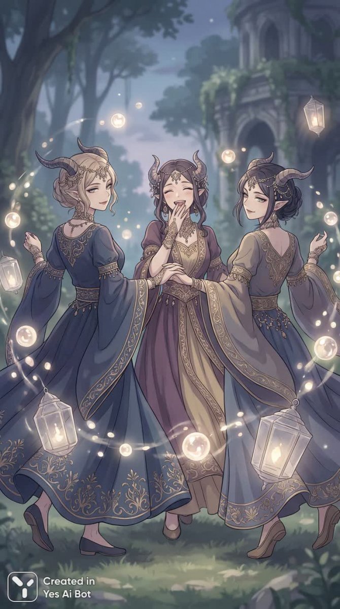3girls, (a trio of succubi) 😈✨, (charming laughter) 😂💜, (surrounded by floating lights) 🎆, (intoxicating atmosphere) 🖤💫, (dynamic energy) ⚡, (wearing intricate accessories) 👑, (mysterious glances) 👀, (embodying beauty and grace) 💕, (whirling in a dance) 🕺💃, (themes of allure) 🌹💖, (creating a dreamlike scene) 😍✨.