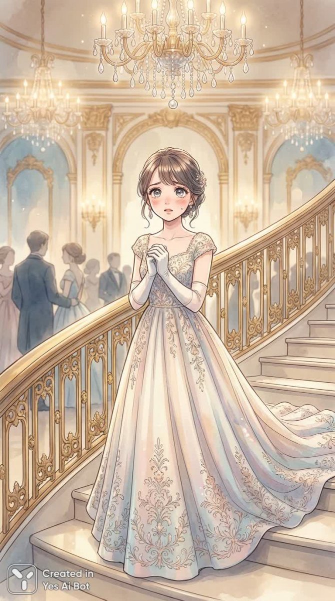 1girl, (dressed for a gala) 👗🌹, (walking up the staircase) 🎉✨, (feeling nervous but excited) :o, (soft whispers of elegance) 🤫, (glimmering chandeliers) 💡, (golden decor) 💛, (eyes sparkling with hope) 🌟, (dreaming of romance) 💞, (atmospheric background music) 🎼, (poised and confident) 💪😊.