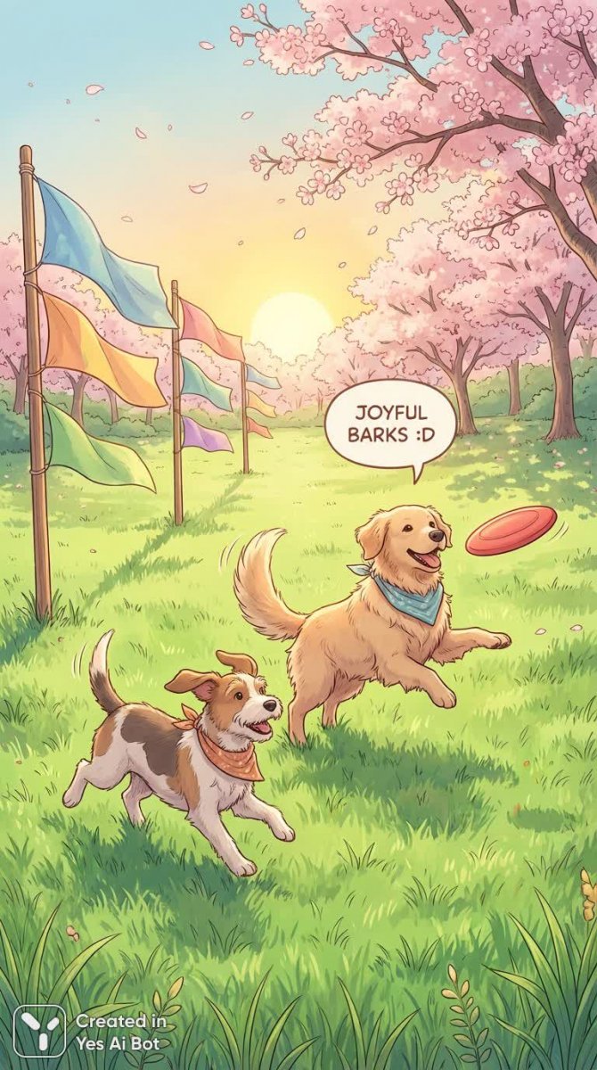 2dogs, (playing in a park) 🐶🐾, (flags waving in the breeze) 🎏🌬️, (chasing a frisbee) 🥏💨, (joyful barks) :D, (vibrant grass) 🌱🌳, (happy tails wagging) 😄🐕, (cheerful excitement) 🐾💕, (sunny afternoon) ☀️, (friends having fun) ❤️🐕‍🦺, (feeling carefree) ^_^.