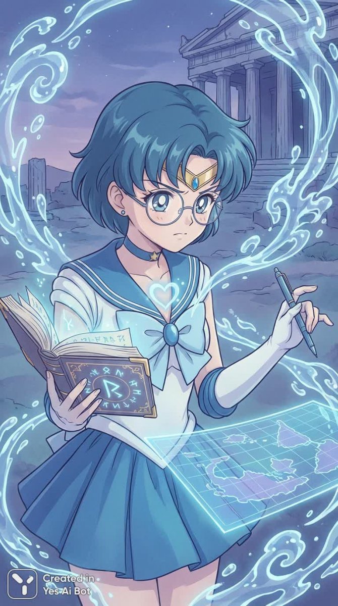 1girl, (Sailor Mercury) 🌊📚, (holding a book) 📖✨, (intellectual charm) 🤓💖, (ocean blue outfit) 👗💙, (calculating and clever) 🧠✨, (spreading wisdom) 🌌📊, (water elements dancing) 💧🌊, (focused and intense) 😤💦, (strategizing in a battle) ⚔️✨, (feeling empowered) 😃🌟, (her heart is pure) 💖🌈, (bringing peace) 🌏💙.