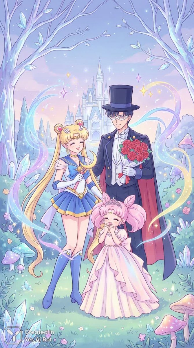 1girl, 1boy, (Sailor Moon with her staff) 🌙✨, (Tuxedo Mask with roses) 🌹❤️, (little princess giggling) 👸😇, (fantasy world background) 🏰🌌, (playful magic sparks) ✨💫, (expressions filled with joy) ^_^💖, (swirling colors around them) 🌈💖, (feeling like a family) 🥰, (embracing their heroic roles) 💪✨, (joyful anticipation) :D💞.