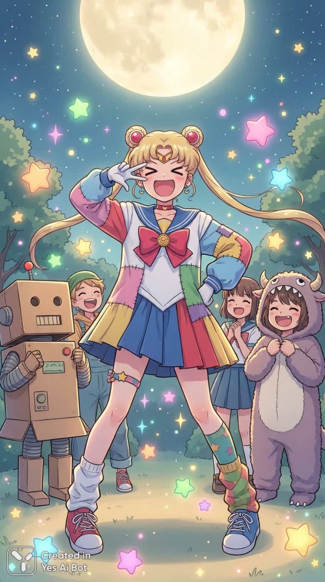 1girl, (funny Sailor Moon outfit) 🌙✨, (striking a silly pose) 🤪💖, (exaggerated facial expression) :D:D, (moonlight background) 🌕🌌, (colorful sparkles) ✨✨, (playful surroundings with stars) ⭐️⭐️, (surrounded by quirky friends) 👯♀️, (shares a laugh) 😂😂, (full of energy and mischief) 😜, (creating a lighthearted atmosphere) ^_^💫, (delighting everyone around) 🎉🌈.