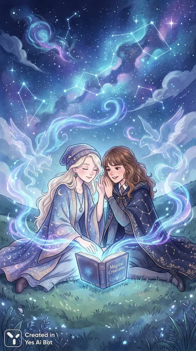 Две волшебницы, Луна и Гермиона, вместе созерцают звездное небо в таинственной атмосфере, их взгляды полны мечтаний о чудесах магического мира. Они одеты в яркие, неповторимые наряды, вокруг них мерцают искры волшебства, создавая ощущение сказочного сна. Девушки делятся секретами, их лица светятся от радости и доверия, демонстрируя крепкую дружбу, основанную на взаимопонимании. В их глазах отражается удивление и любопытство по отношению к невероятным магическим существам, обитающим в далеких галактиках, словно они заперты в собственном мире, где царит гармония и волшебство. Выражения лиц спокойные и умиротворенные, передающие ощущение безмятежности и счастья от общения друг с другом. Эта сцена – воплощение истинной дружбы, смелости и готовности принять неизведанное, окутанная волшебным сиянием звездного света и нежной лунной ночью. Их связь крепка, сердца наполнены любовью и верой в чудеса. Изображение выполнено в стиле аниме с высокой детализацией нейросетью Nano Banana v.1.0 Pro.