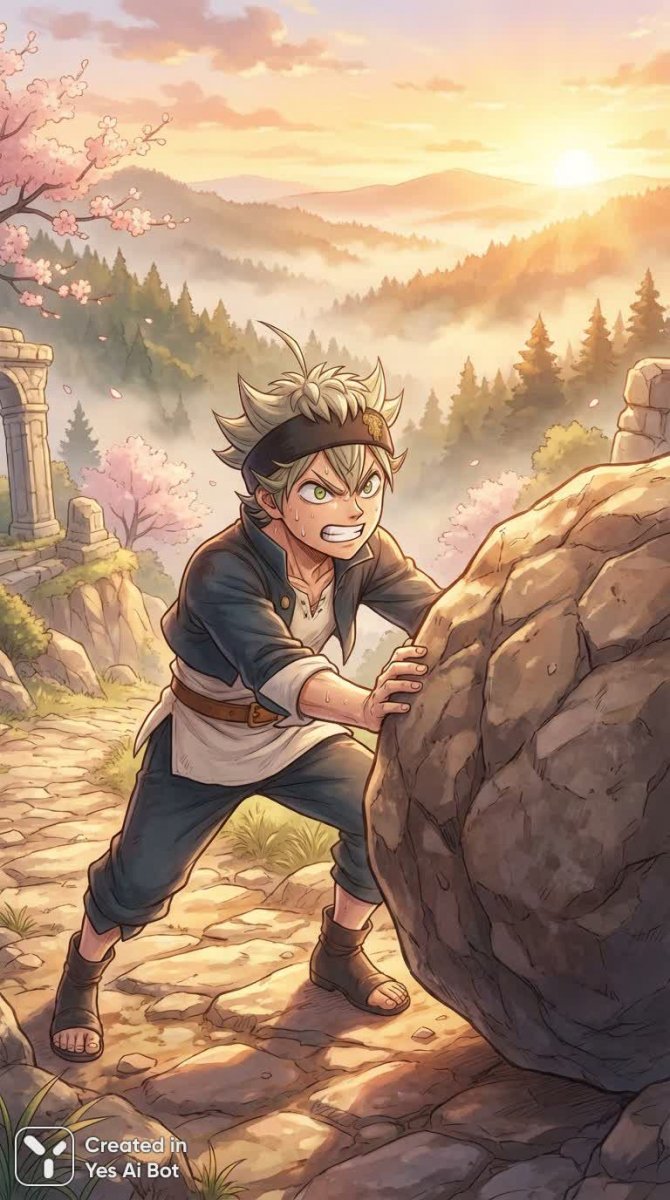 1boy, (Asta training hard) 🏋️♂️🔥, (with a serious expression) 😠⚔️, (sunrise in the background) 🌅☀️, (pushes through his limits) 🏆💪, (sweat glistening on his forehead) 💦, (determined to prove himself) 😤⭐, (the spirit of a true warrior) 🦸♂️💥, (never backing down) 🔥🌈, (embracing the challenge of becoming stronger) ^_^✨.