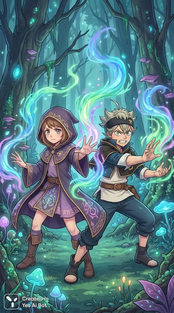 1girl, 1boy, (Asta and Witch collaboration) 🧙♀️🗡️, (mystical forest backdrop) 🌲🌌, (casting spells together) ✨🔮, (intense focus) 😤🔥, (dynamic poses) 🏃♂️💨, (exploding magic energy) 💥💫, (colorful auras) 🌈🌌, (determined expressions) :|, (feeling the thrill of adventure) 🌟🚀, (friendship bond strengthening) ❤️💖.