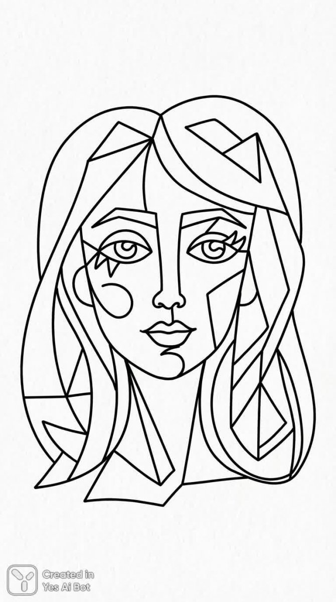 Изящный женский портрет, выполненный в стиле кубизма, представляет собой черно-белое схематичное изображение, напоминающее раскраску для детей. Использование разнообразных форм и углов создает динамичную композицию, где каждая линия играет свою роль в формировании образа. Минималистичный подход к изображению лишен теней, фокусируясь на чистых контурах и геометрических фигурах. В портрете прослеживается легкая игривость и причудливость деталей, что добавляет ему очарования и неповторимости. Это не просто изображение лица, а скорее абстрактная интерпретация женской красоты, где формы переплетаются, создавая ощущение движения и живости. Отсутствие детализации позволяет зрителю самому дорисовать образ, наполняя его своими эмоциями и фантазиями. Картина излучает спокойствие и умиротворение, приглашая к созерцанию и размышлениям о природе женственности и искусства кубизма. Эта работа – пример гармоничного сочетания простоты и выразительности, где каждый элемент тщательно продуман для создания целостного и запоминающегося образа. Оно выделяется своей лаконичностью и элегантностью, предлагая зрителю уникальный взгляд на классический жанр портрета