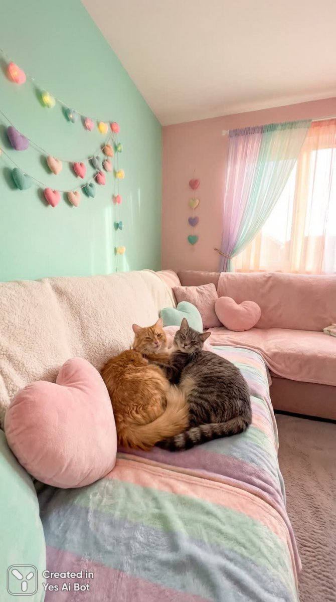 2. two adorable cats, cuddling together, heart-shaped decorations, kawaii style, playful expressions, soft pastel colors, photorealism, wide-angle shot, 24mm lens.