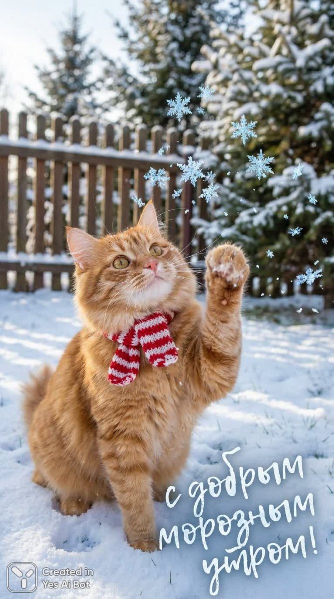 playful ginger cat, icy blue snowflakes, cheerful pose, wearing a tiny scarf, looking up, vibrant colors, "с добрым морозным утром!" text, photorealism, wide-angle shot, DSLR camera. Text on Russian: "C добрым утром!" (В конце восклицательный знак)