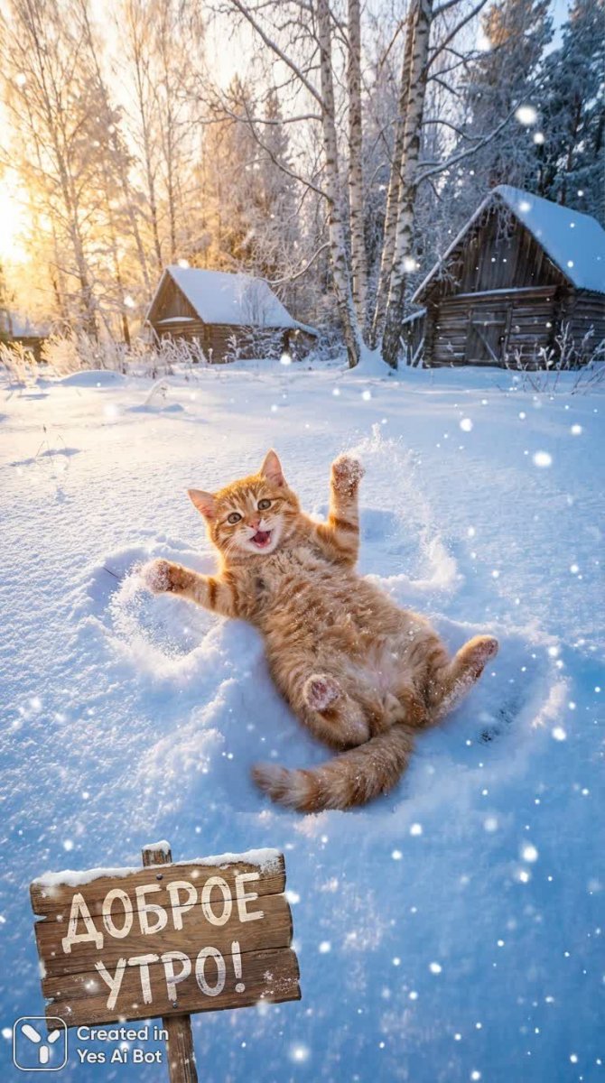 cute orange kitty, making snow angel, caught mid-action, winter wonderland scene, joyful expression, "с добрым морозным утром!" added, vivid colors, 24mm lens, cinematic quality. Text on Russian: "Good morning!" (В конце восклицательный знак)