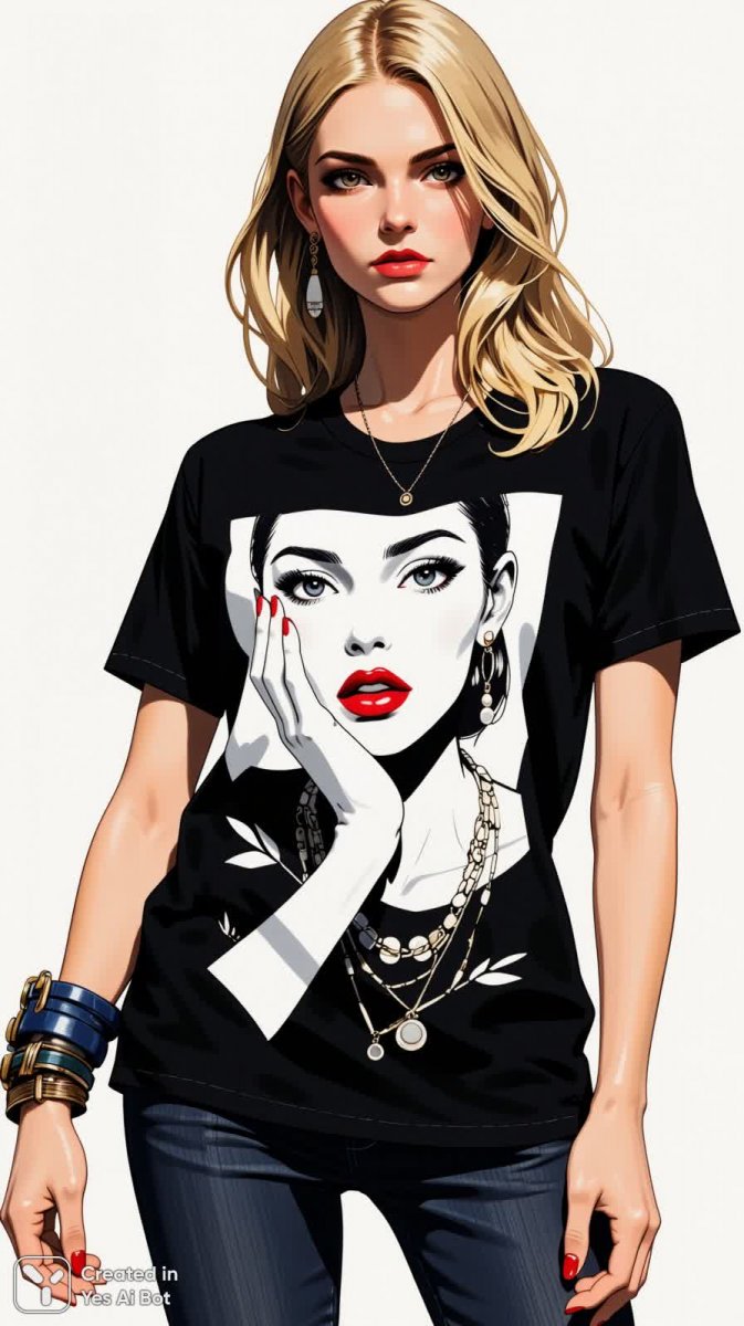2. fashion model woman in a black t-shirt, minimalist female face print, red manicure, stylish jewelry, abstract modern art, striking black and white design, fashionable urban scene.
