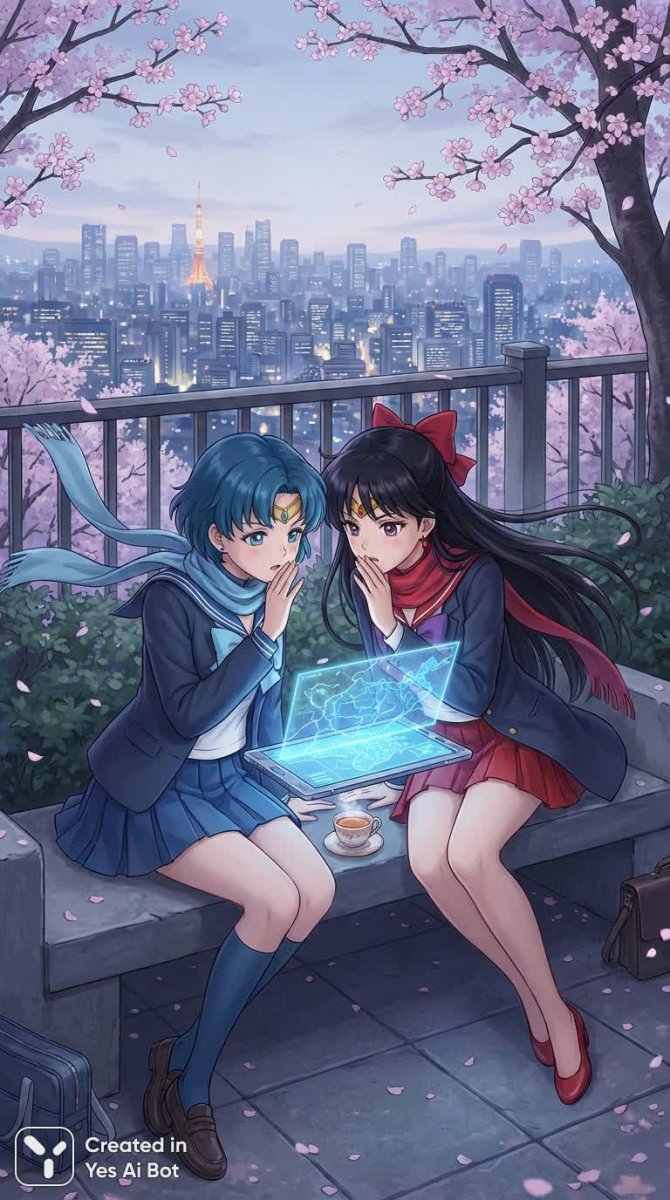 Две воительницы, Меркурий и Марс, погружены в тихую стратегическую сессию на фоне панорамного вида Токио. Их лица выражают сосредоточенность и легкую тревогу, смешанную с предвкушением предстоящих событий. Легкий ветерок нежно треплет волосы, добавляя умиротворения этой сцене крепкой дружбы и взаимопонимания. В их руках – передовые технологии будущего, помогающие разрабатывать секретный план. Они полны решимости защитить своих друзей и близких, чувствуя ответственность за судьбу тех, кого любят. Обстановка располагает к доверию и открытости, ведь они делятся сокровенным замыслом, готовые к любым вызовам. Эта иллюстрация воплощает в себе силу женской дружбы, смелость и готовность к самопожертвованию ради защиты тех, кто дорог. Атмосфера спокойствия нарушается лишь легким волнением, которое добавляет динамики и интриги происходящему. Кажется, что за каждым их взглядом скрывается нечто большее – готовность к действию и непоколебимая вера в свои силы. Вся сцена пронизана теплом и заботой, создавая ощущение уюта и безопасности
