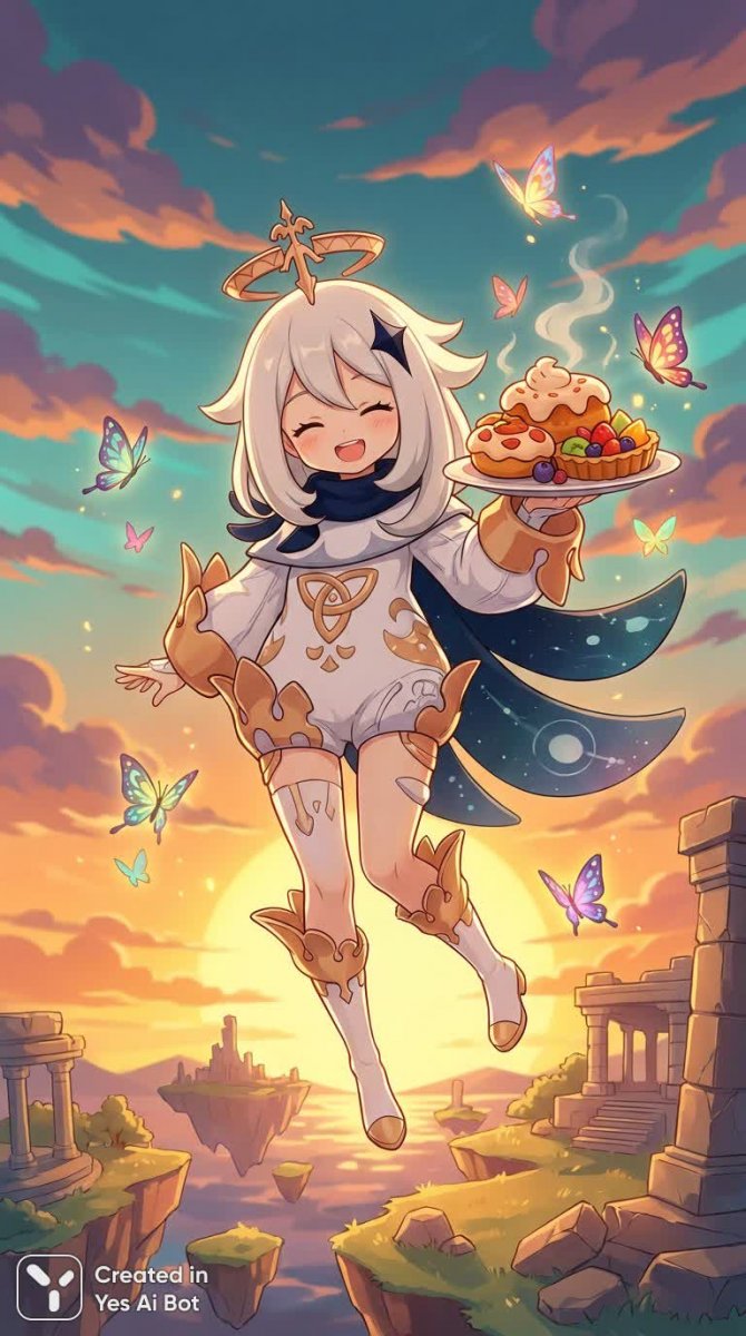 Игривая радость и безмятежное счастье наполняют этот волшебный момент, запечатленный в ярких красках Тейвата. Пэймон, с лучезарной улыбкой на лице, окружена нежно-бирюзовым сиянием неба, словно сама воплощает собой летнее настроение. Ее озорной взгляд выдает маленький секрет, а на руках – аппетитное угощение, готовое утолить самый изысканный голод. Волшебные бабочки, словно ожившие цветы, порхают вокруг нее в танце легкости и красоты, добавляя картине еще больше очарования. Выражение ее лица – это квинтэссенция милоты, способной растопить даже самое холодное сердце. Она одета в свой неповторимый наряд, который стал символом ее неуловимой энергии и жизнерадостности. На заднем плане закатное солнце окрашивает горизонт в пастельные тона, создавая атмосферу умиротворения и спокойствия. Пэймон наслаждается этой минутой безмятежности, словно запечатлевая в памяти всю прелесть окружающего мира. Этот образ – это настоящая квинтэссенция Тейвата, его красоты, его магии и его бесконечного очарования, сотканного из радости, дружбы и незабываемых впечатлений. Это воплощение счастья, которое хочется сохранить навсегда в своем сердце