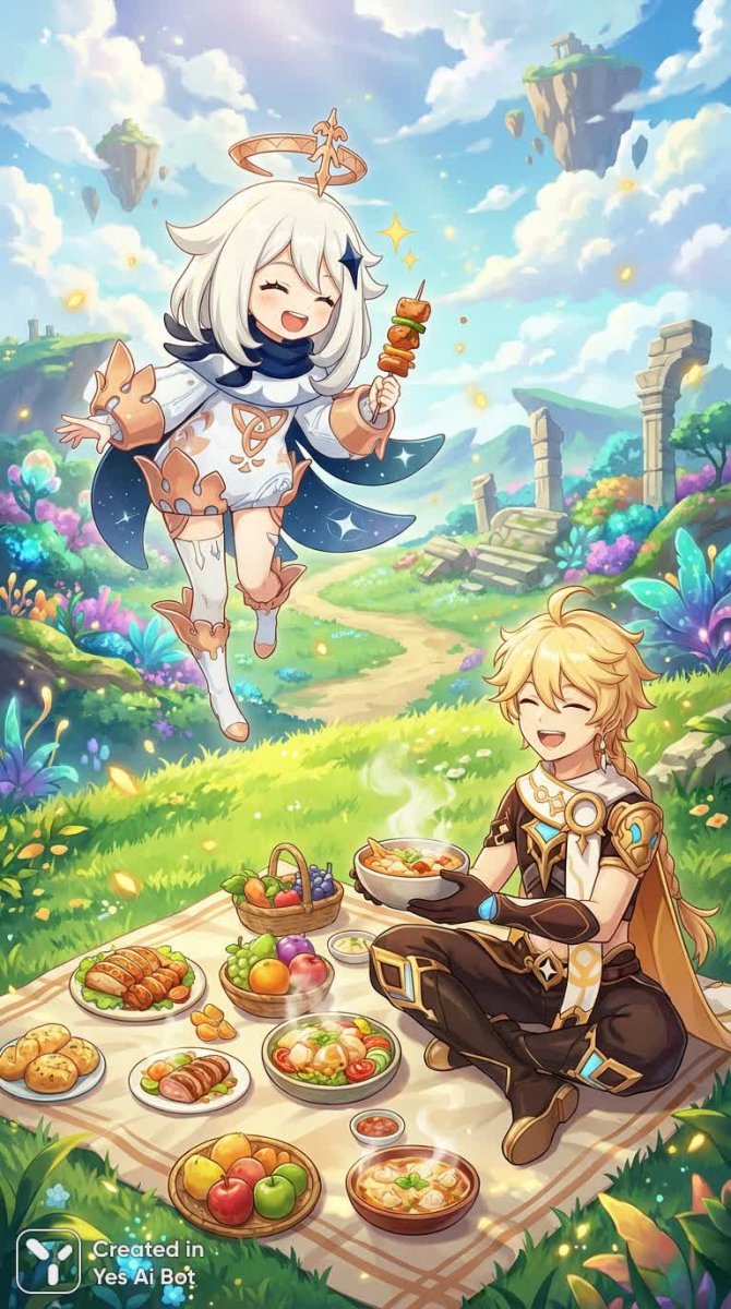 Радость Пэймона: приключения и вкусные угощения с Путешественником в ярком мире Genshin Impact - Генерация в нейросети Нано Банана