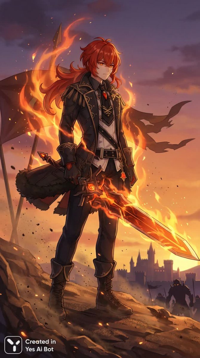 1boy, (Дилюк, готовящийся к бою) ⚔️🔥, (задний фон с закатом) 🌅🪄, (огорчение на лице) 😕💔, (в окружении огненной ауры) 🔥🌟, (беспокойство за любимых) 🥺❤️, (светлые глаза) 👀🌌, (фиксация на врагах) 😤🔭, (глубокое дыхание) 😤💨, (решимость и мужество) 💪😠, (ориентация на цель) 🎯🧐, (повелитель огня) 🦸♂️🔥.