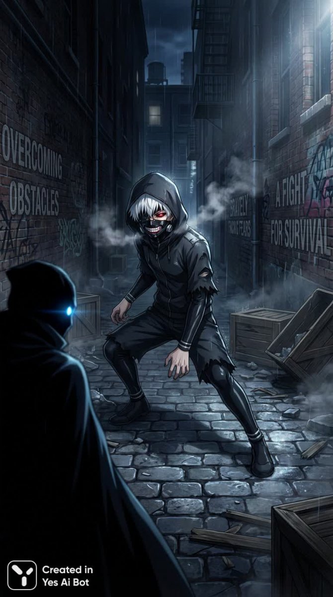 Кен Канеки: Битва за выживание в тени аллеи и столкновение с врагом - Картинка, созданная ИИ Nano-Banana