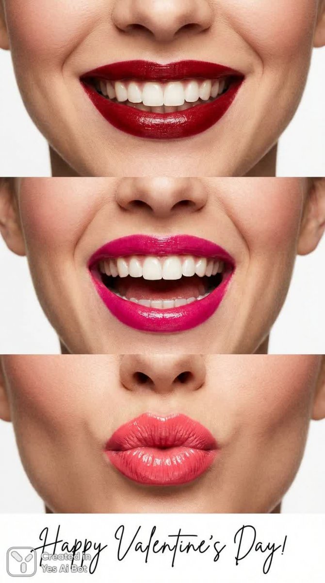 three female mouths with vibrant expressions, different lip colors, close-up, white BG, clean glossy photography style, studio lighting, intricate detail, "Happy Valentine's Day!"