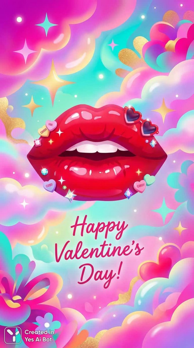 red sensual lips with playful accessories, glossy surface, vibrant colors, fantasy BG, high detail, artistic lighting, modern illustration style, "Happy Valentine's Day!"