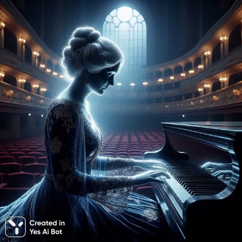 В полумраке концертного зала изображена призрачная фигура пожилой европейской дамы, играющей на старинном рояле. Ее полупрозрачное тело освещено зловещим неоновым светом, подчеркивающим высокую прическу и изысканное темно-синее бархатное платье с золотым узором. Лунный свет проникает сквозь высокие арочные окна, создавая серебряные блики на пустых рядах алых кресел, усиливая атмосферу таинственности и одиночества. Лицо дамы выражает безмятежную нежность, глаза закрыты в состоянии глубокой сосредоточенности, пальцы легко касаются клавиш. Картина, снятая под низким углом, подчеркивает величественную высоту сводчатого потолка, создавая ощущение монументальности и величия. Используется техника темной живописи, где глубокие тени контрастируют со светлыми бликами, выделяя призрачную фигуру на фоне мрака, усиливая мистическое воздействие произведения и приглашая зрителя в мир вечных тайн и затерянных мелодий, вызывая чувство меланхолии и очарования.
