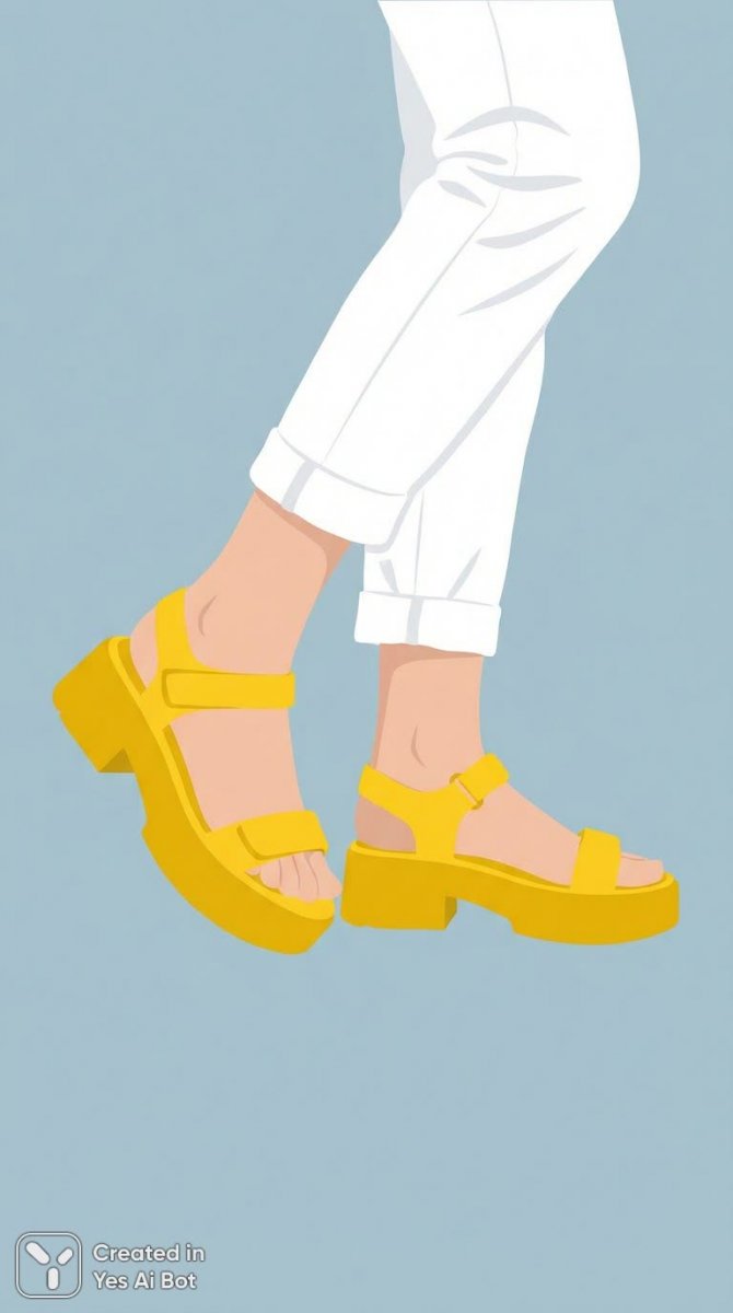 4. legs in white cropped jeans, yellow platform sandals, light skin, minimalist style, solid color background, vector illustration, focus on footwear.