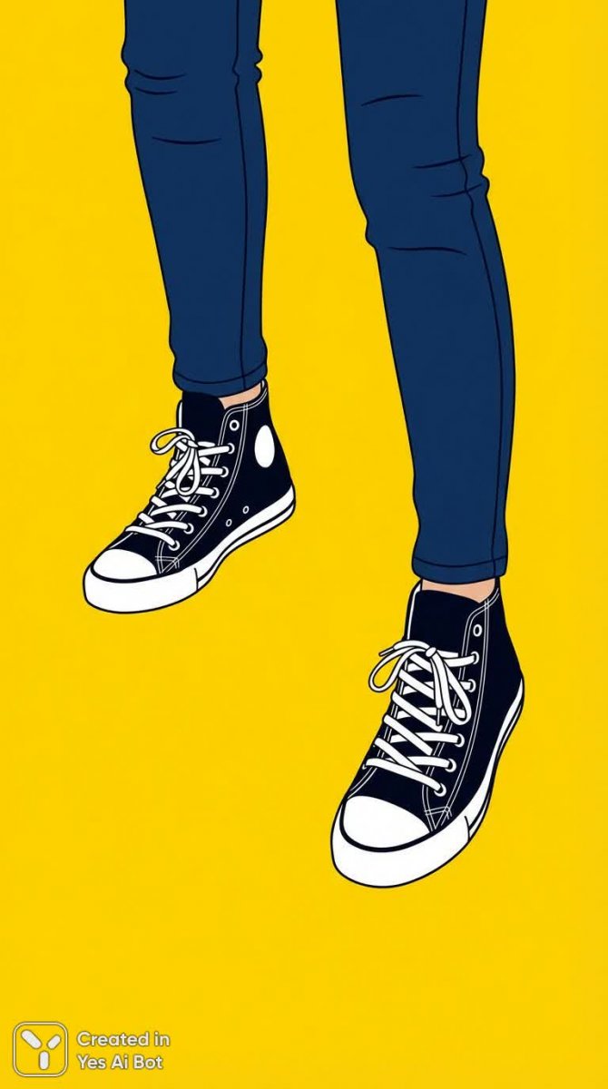 Изящные ноги девушки в облегающих синих джинсах демонстрируют современный городской стиль. Акцент на деталях: черные высокие кроссовки с белыми акцентами добавляют динамичности образу, а вид снизу подчеркивает стройность силуэта и вытянутость ног. Яркий желтый фон создает контрастный эффект, выделяя фигуру и придавая изображению современную свежесть. Эта цифровая иллюстрация выполнена в чистом графическом стиле, характеризующемся четкими линиями, лаконичностью форм и отсутствием лишних деталей. Работа демонстрирует мастерство художника в создании стильных и выразительных образов, сочетая в себе элементы моды, уличной культуры и современного искусства. В целом, изображение передает ощущение легкости, энергии и уверенности в себе, подчеркивая индивидуальность и современный взгляд на стиль одежды. Отличное решение для рекламы джинсовой ткани или обуви, а также для создания визуальных концепций в области моды и дизайна