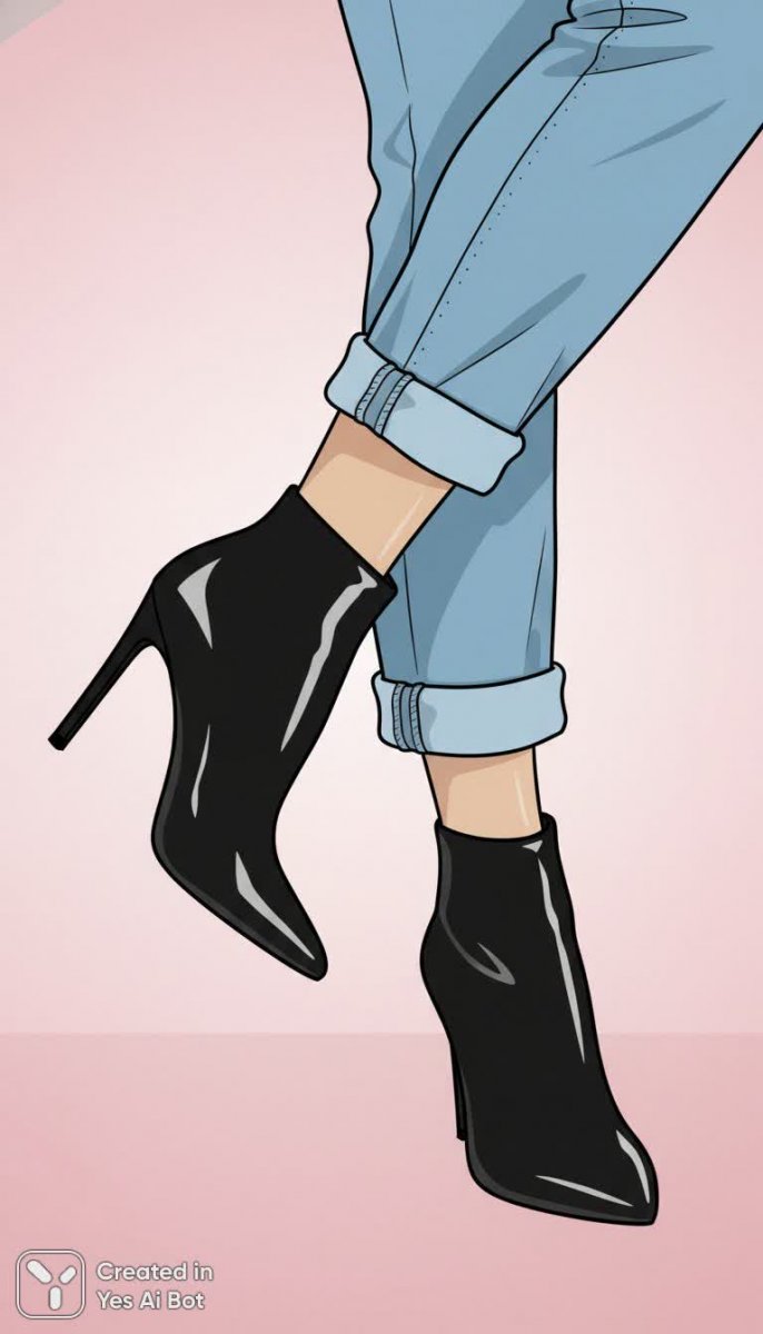 1. female legs in black heeled boots, rolled-up light blue jeans, minimalist pink BG, flat style illustration, focus on footwear, modern design.